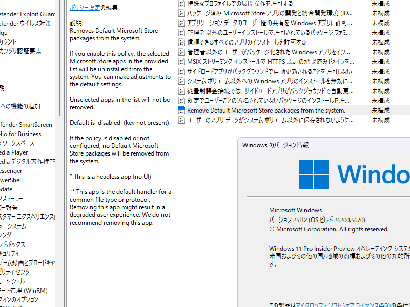 正確に言うとローカルグループポリシーエディター(gpedit.exe)によるポリシーの編集を公式にサポートしているWindows 11 Proでも2025 Updateに更新すれば「コンピューターの管理→管理テンプレート→Windowsコンポーネント→アプリパッケージの展開」内に「既定のMicrosoft Storeパッケージをシステムから削除します。」という項目が追加されていて、有効にすることでアプリを削除するためのグループポリシー設定がレジストリに書き込まれるのですが、この機能を有効化できるのは法人向けに提供されている「Enterprise」と教育機関向けに提供されている「Education」のみで、「Pro」では設定しても特にストアアプリが削除されることはありません。当然「Home」で直接レジストリを設定しても同様になります。