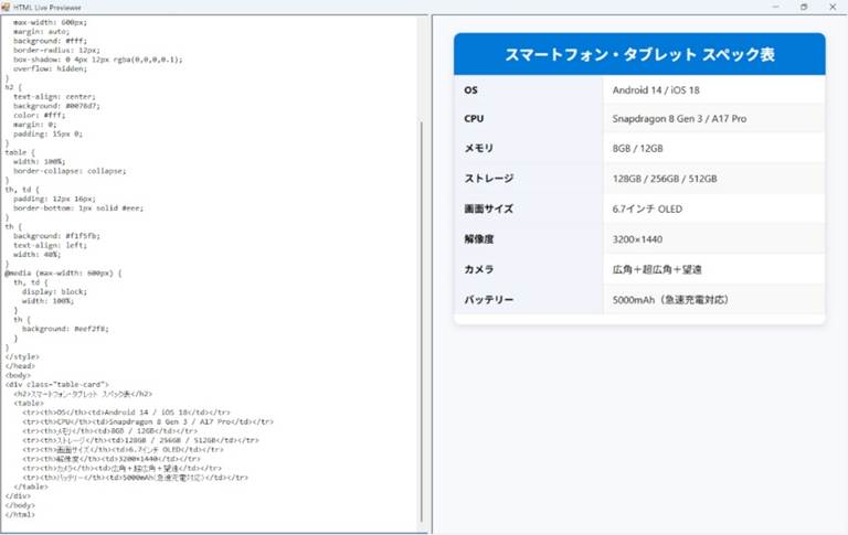 ぼちぼち個人ブログなども含め、PCやすまほん・椨などの実機レビューを再開する予定ですが、それに伴い前々からほしかった「HTMLのテーブル(表)をWYSIWIGでプレビューしながら編集できる奴(仮称)」を朝起きたタイミングでGemini CLIたんに作ってもらったので公開します。