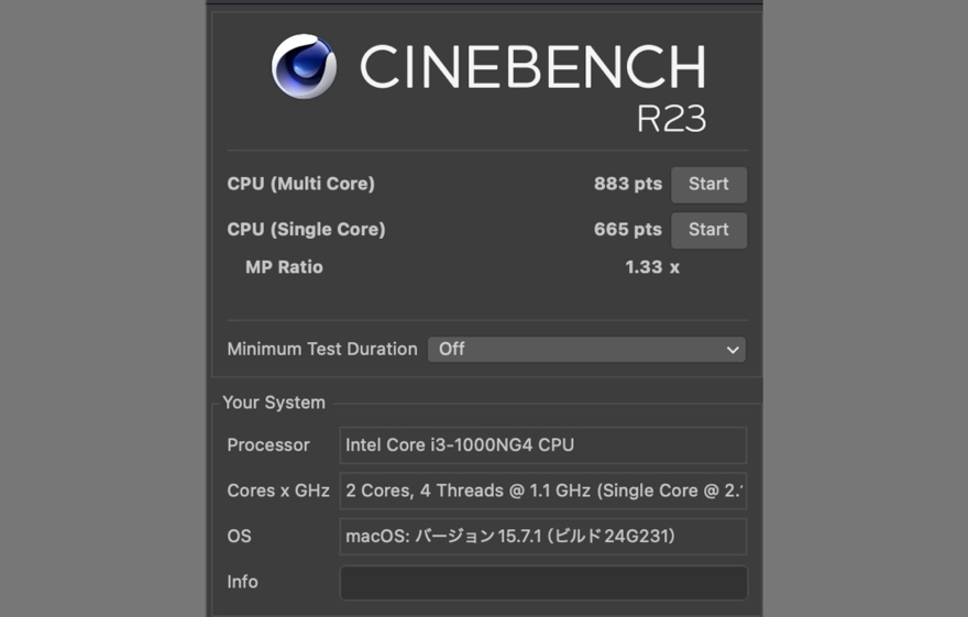 まずはCineBenchから。Ice Lake世代だとi5以降であればシングル・マルチともにかなり高いスコアを計測してくれるのですが、2コア4スレッド動作のi3-1000NG4だとまぁこんなもんでしょうかね。ただそれでもSkylake世代のCore i5-6210U搭載まくぶくぷろ(13-Inch Four Thunderbolt Port)に近いスコアを「i3で」叩き出してしまっているのは十分凄い話ではあるのですが・・・