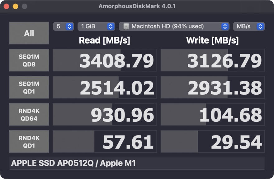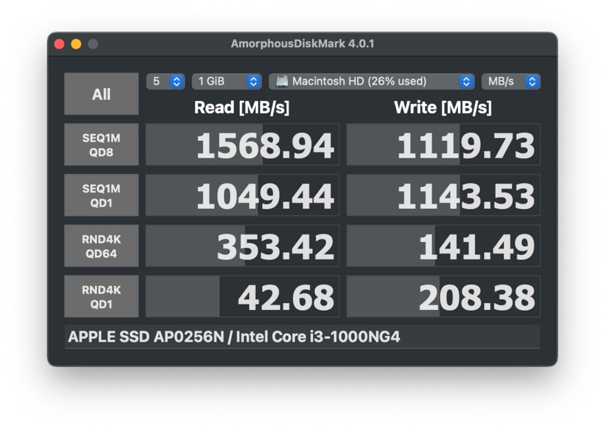 SSDはどちらもPCI-NVMe接続のものが搭載されていますが、読み書き速度もApple M1のほうが高速になっています・・・なっていますが、普段使いであればIntelえあえあでも十分高速です。大容量データを取り扱うのであれば体感的な差もわかりやすそうではあるのですが・・・