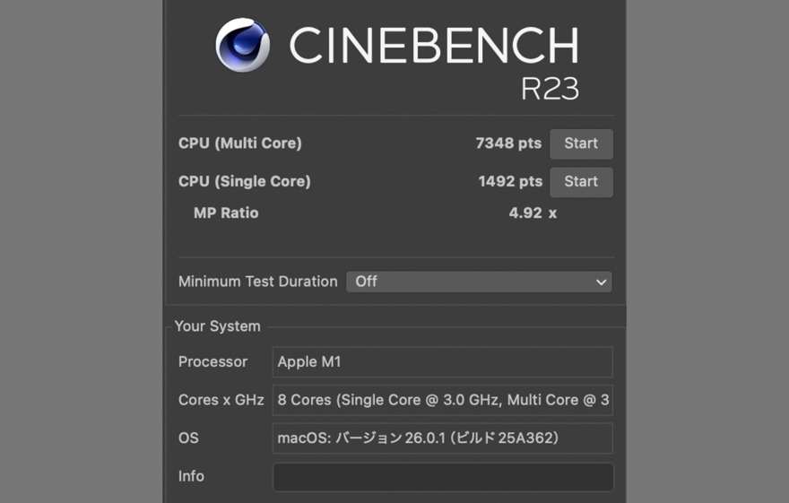 半年後に登場したM1えあえあになるとシングル・マルチともにスコアが大幅に向上。無論この記事を執筆している時点で最新世代となるApple M5になるとさらにヤベーことになってくるのですが、正直発売から5年が経過した2025年11月現在でも全く不満を感じる場面はないので本当最高の相棒という感じです。ただこんな化け物を積んだ、同じ筐体を搭載した後継モデルがわずか半年後に出てしまったのはIntelえあえあ(2020年)にとってやっぱり不幸だったなぁとは・・・