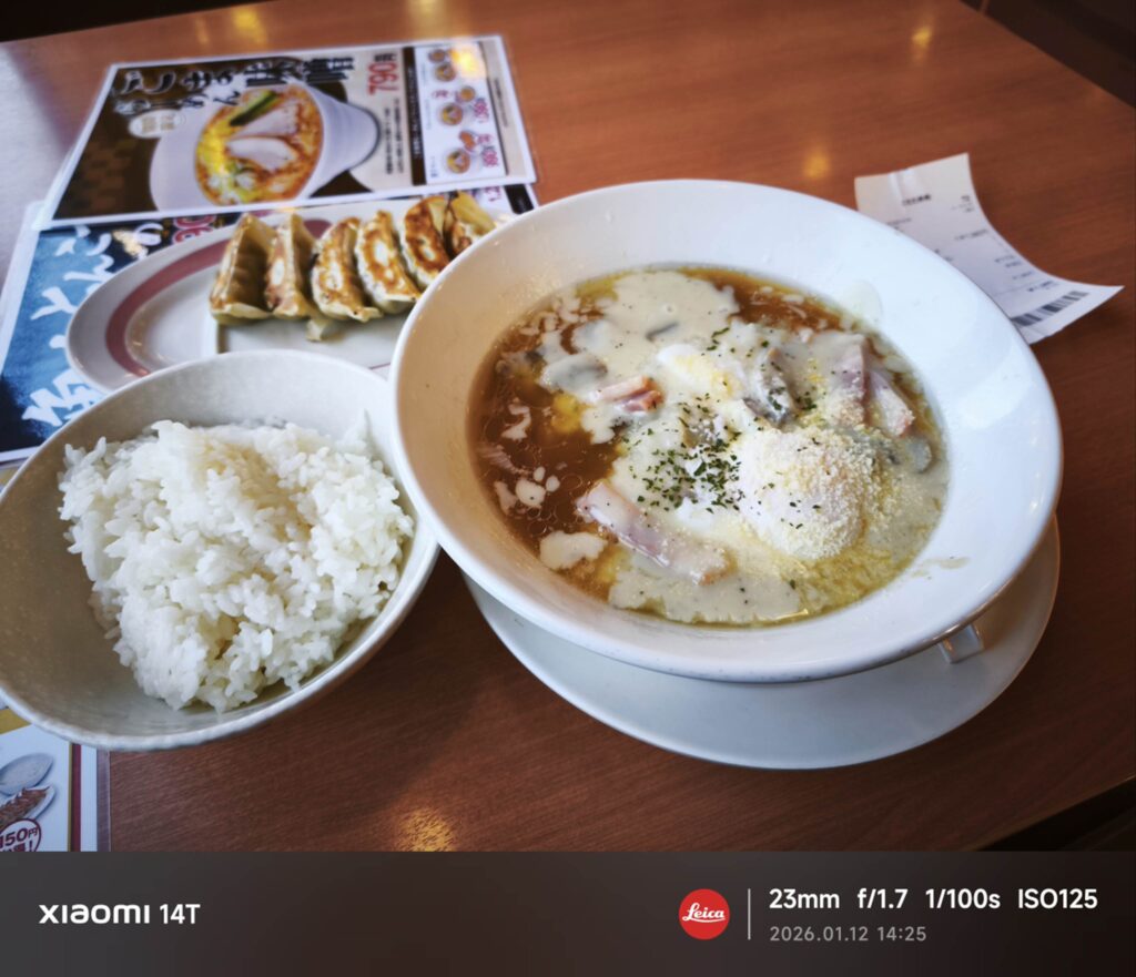 ちなみに普通盛り・カルボラーメン単品での価格は890円、麺 + 大盛りにした上で餃子とライス(こちらも大盛りに変更)を付けても1,350円で済んでしまいます。ただし幸楽苑で提供されている通常メニューにも言えることですが、ラーメン、ライスともに大盛りオプションに変更しても量的には他の店舗における普通盛り程度なのでかのあゆみたいながっつり食いたいデブだとかなり物足りないと感じるかもしれません。