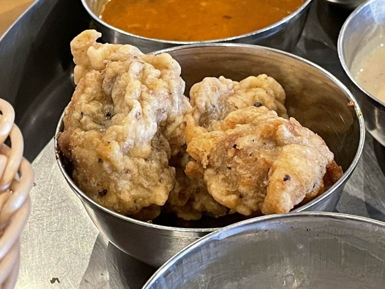 から揚げは基本的にカレーをディップしていただくことを想定しているため、脂っこくなくさっぱりとした味付けになっています。タンドリーチキンは少しピリ辛なので、辛いものが苦手という方はラッシーや一緒に提供されているデザートと一緒にいただくと良いかもしれません。