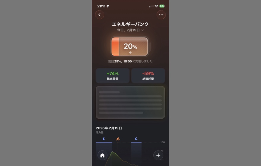 「エネルギーバンク」はその名の通り心拍数や睡眠・運動データなどの記録を組み合わせて一日にどれだけ疲れているかを「バッテリー」として目視できるようにできる機能です。