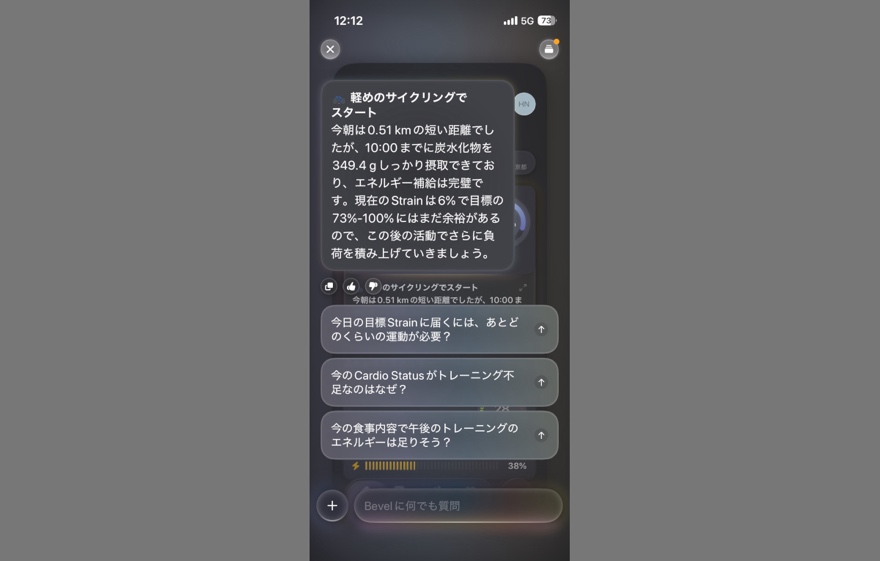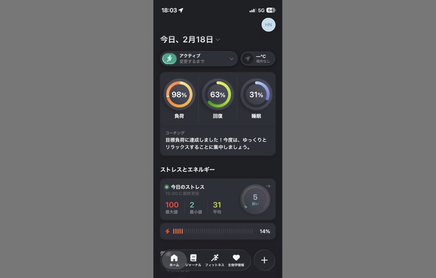 その他の睡眠・運動・各種健康データは「ヘルス」で取得しているものをそのまま持ってきていますが、わりとUIがごちゃついているせいで記録の確認がおっくうになってしまうことが多い「ヘルス」とは異なり、一括で一日の記録を目視しやすくなっているだけでなく、1日の負荷・回復量・睡眠データを纏めて確認することも出来るのは重宝します。
