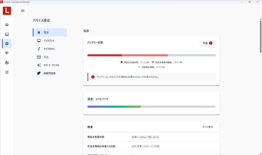 これだけでも半分嫌な予感はしていたのですが、「ま・・・まぁこれこそ中華製品だし?それでも中のセルは新品だから純正よりは持たないにしてもちゃんと使えるはず・・・」ということでそのまま使うことにしたのですが、昨年後半あたりからバッテリーの減りが異様に早くなり、嫌な予感がしたのでLenovo Vantageでステータスを確認してみたところ・・・