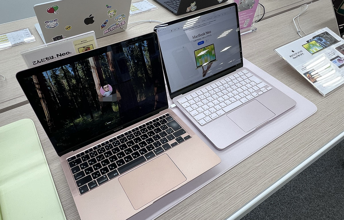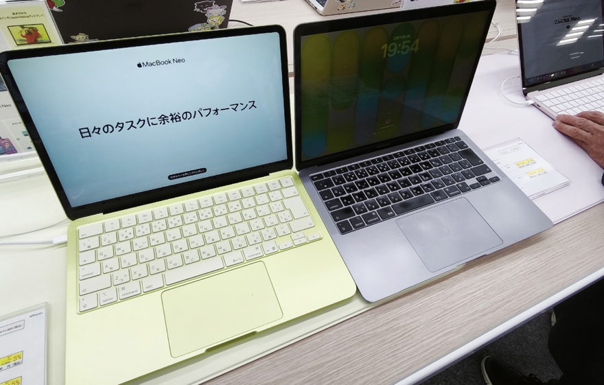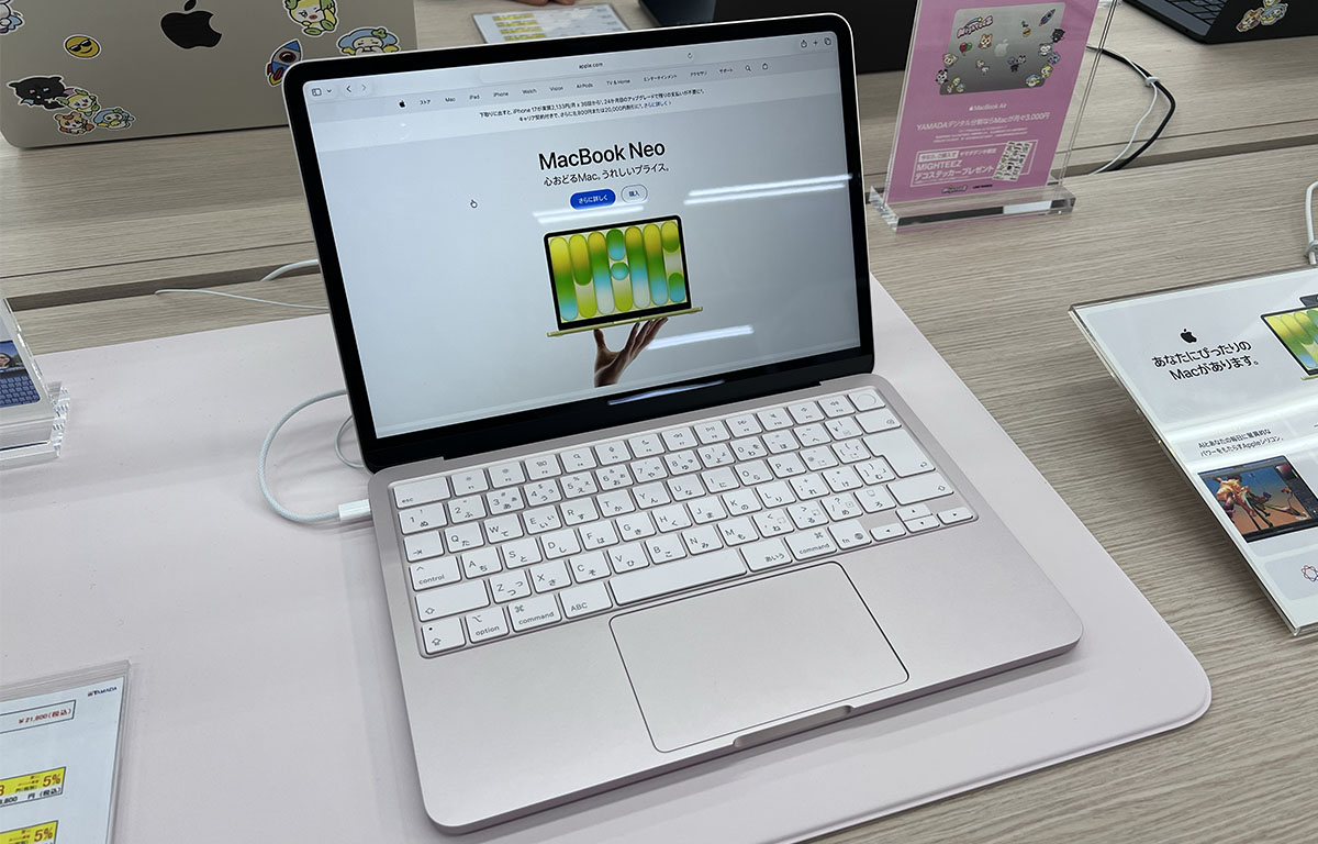立ち寄ったのはヤマダ電気池袋総本店で、256GBモデル(シトラス)と512GBモデル(シルバー)の2台が展示されていました。同時発売となったM5えあえあ(M5 MacBook Air)も展示されていましたが、かなり久々の「購入しやすい価格帯のまくぶく」ということで立ち寄ったタイミングだとねおにゃあのほうが注目されていた印象でした。