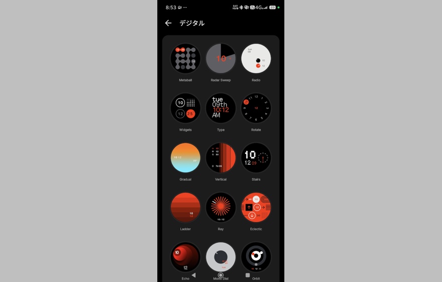 種類も豊富で全体的にスタイリッシュなデザインのウォッチフェイスが多数用意されていますが・・・逆に言うと初期リリースの頃から追加も行われていないようなので人によっては飽きてきてしまうかもしれません・・・