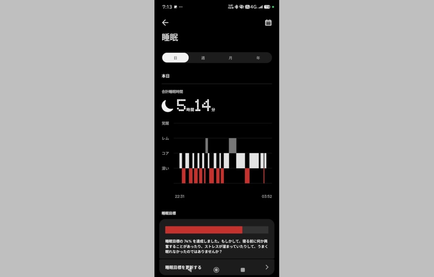 睡眠記録は毎回かのあゆがスマートウォッチ/バンド製品の実機レビューを公開する際に書いているとおり、採用されているアルゴリズムが異なるためレム・ノンレム睡眠の記録に関してはApple Watch Series 7やXiaomi SmartBand 10などの他社製品でも参考程度にとどめるべきだと考えていますが、入眠・起床時間については取りこぼしが発生する場合も多々あるものの概ね実際通りとなっています。