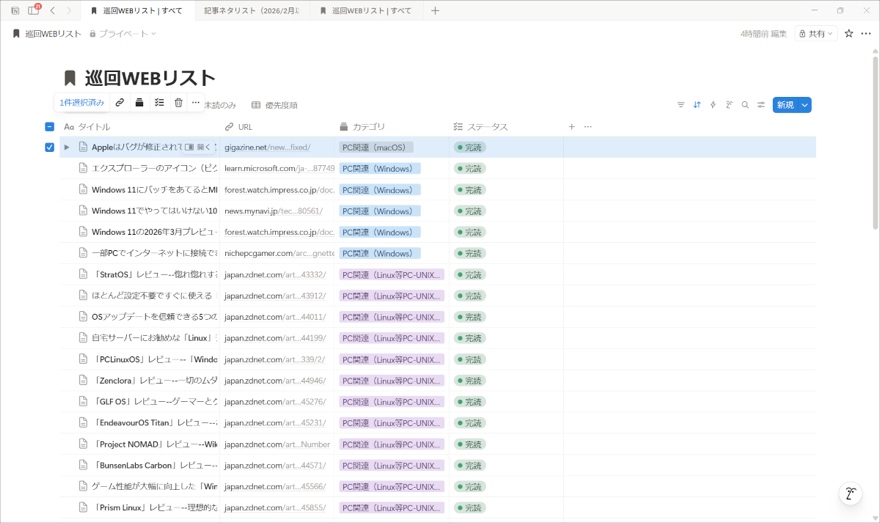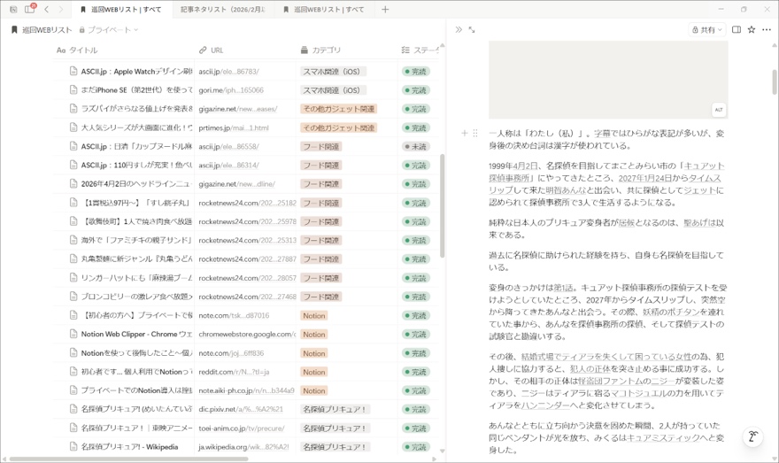 WEBクリップはNotionで作成したデータベースに送ることも可能になっているので、上記リンクにある川越 俊彦さんのNoteページと同じように「カテゴリ・ステータス」を設定した上で気になった情報、あとでゆっくり読みたい情報、ブログや寄稿記事を用意する際にネタになりそうな情報をデータベースとして纏めて管理することにしました(タグ管理については今のところ必要なそうなのでかのあゆの場合項目としては設定していません)。