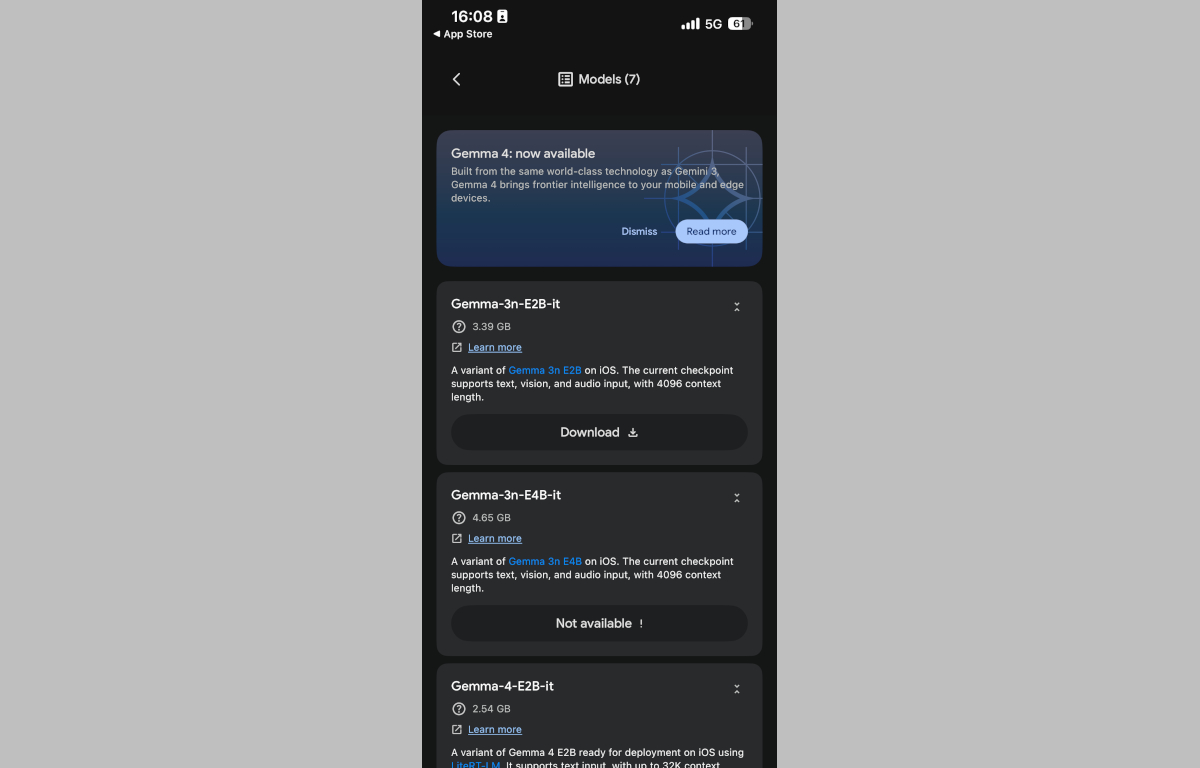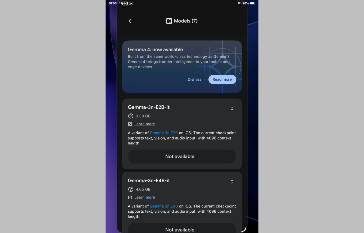ググレカスAI Galleryをインストールした直後の状態ではまだどのモデルもインストールされていないため、メニューから「Models」を選択して早速アインホホ13プヨに「Gemma4」を導入してみることにします。取得したデバイス情報から導入可能なモデルを判定してくれるようで、対応していない場合「Not available」と表示されます。