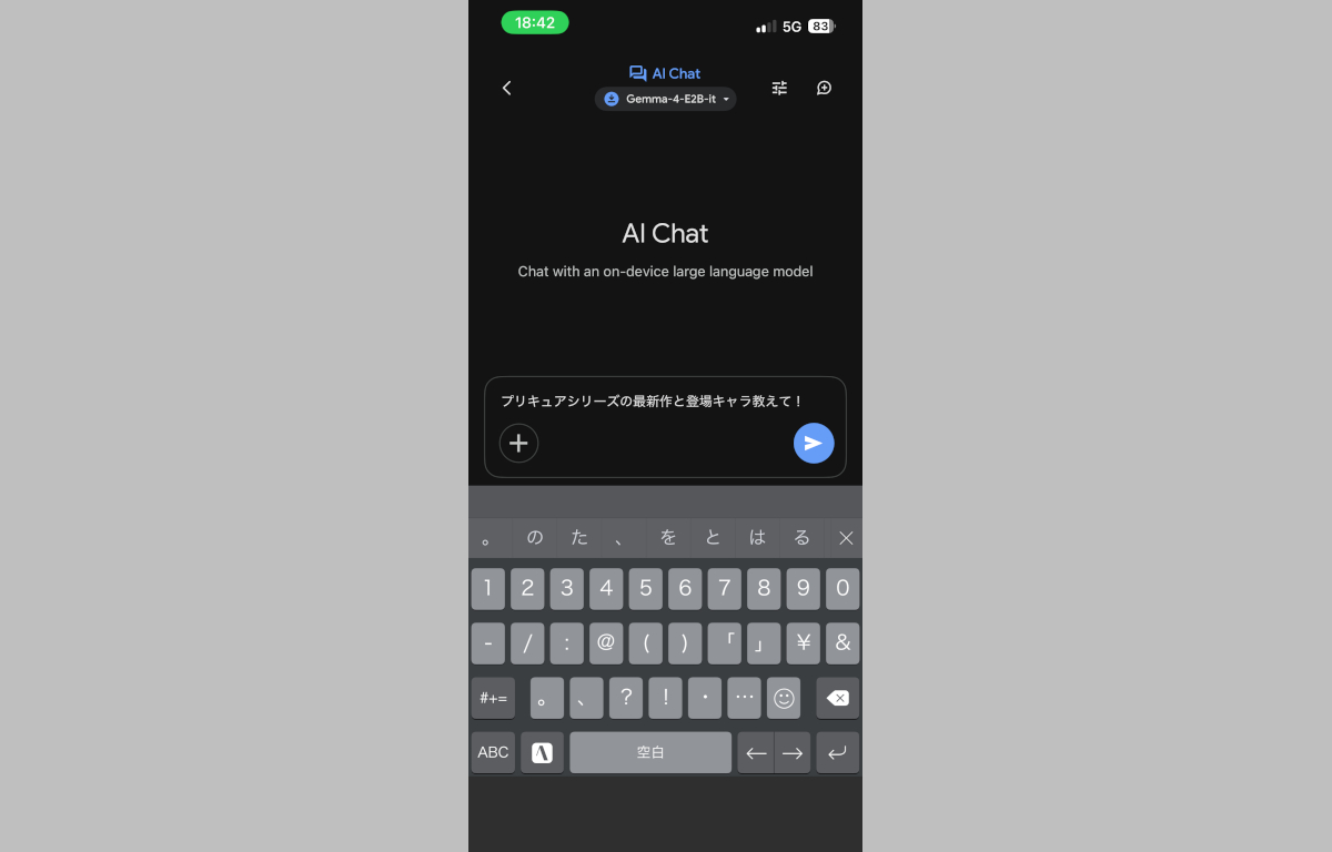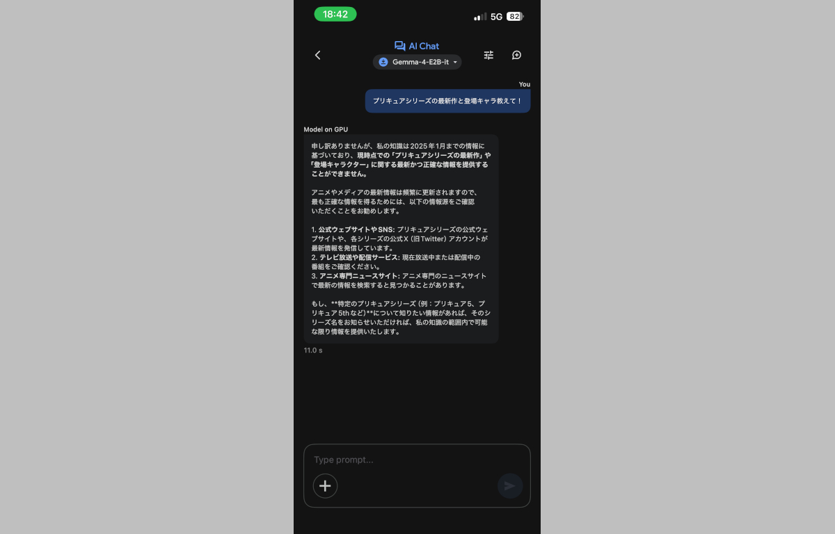 かのあゆ自身ローカルLLM自体は以前から興味があったのですが、高性能モデルを動かすには物価高+半導体価格の高騰+AI需要による値上げのダブルパンチを受けてさらにお高くなってしまったNVIDIA GeForce RTXシリーズなどの高性能GPUが必要となり、スマホ向けの軽量化モデルは確かに動きはするものの簡単なチャットですら文章が破綻する“らしい”ということはWEB上などでも確認していたのであまり積極的には試してきませんでしたし、今回のGemma4 E2Bも「Gemma4シリーズの中では最も軽量なモデル」ということで「どうせ動くだけで実用は無理なんだろうな・・・」:と思っていたのですが・・・