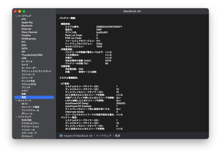 バッテリーについては発売から9年経過したモデルということもあり、そもそもへたっていない個体を見つけるのは困難ですし、かのあゆが購入した個体も充電サイクルが593回という状態だったので、当然「修理しろや!」という警告が表示されています。ですが、今のところ普通に外で作業できる程度には持ってくれています。
