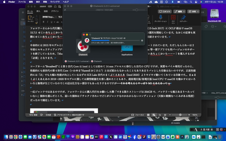 フォロワーさんから代行購入してもらった、どこがジャンクなのかよくわからない超格安まくぶくえあえあ(13-Inch 2017)に、OCLP経由でmacOS 15.7.5 せこいあちょこおいちーーー!の導入と環境構築が完了したので、早速今日からモバイルPCとしての運用を開始しています。なおこの記事も、実際にせこいあちょこおいちーーー!を導入したまくぶくえあえあ2017“だけ”で記事の下書きから投稿まで完結させています。