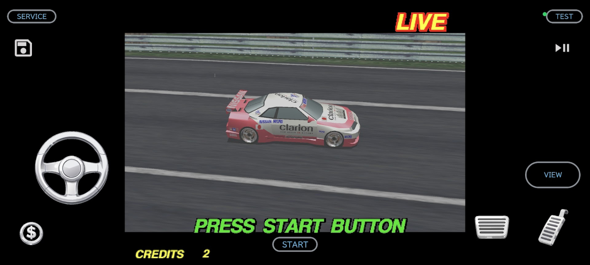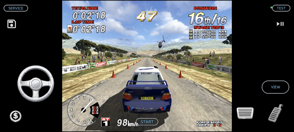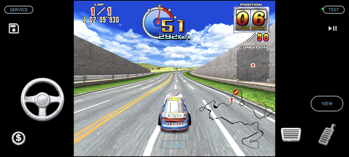 元になっているSuperModelと同じく、ワイドスクリーン表示や高解像度表示もサポートしていますし、前述の通りスマホ向けにバーチャルパッドやティルト操作(!?)もサポートしているので、Bluetoothゲームパッドを接続しない状態でも快適にプレイ可能です(ただし、レースゲームはミッション操作ができないので基本ゲームパッドを接続した方が良さそうですが・・・)