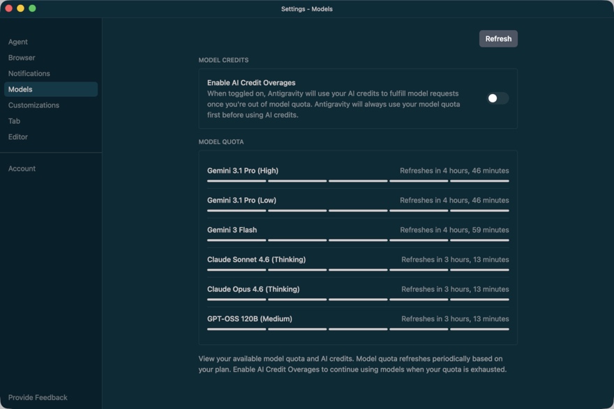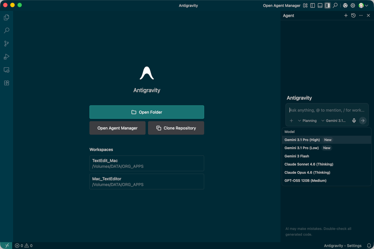 実はググレカスがVisual Studio Code(通称VSCode)のオープンソース版をベースにおじぇみとの連携機能を実装したコードエディター「Antigravity」はくろーどたんの上位モデル、Opus 4.6も利用できてしまいます。しかもサブスクリプションプランのググレカスAIたす・プヨ・うるとらに加入していない無料ユーザーでも利用可能です。