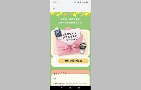 また、まもなくキャンペーンが終了(4月17日から5月3日まで)となってしまいますが・・・現在ウェイウェイへるすアプリ経由で「新緑さんぽ」イベントに参加した上で累計10万歩を達成すると、1週間のみ有償ウォッチフェイスがダウンロードし放題になる「文字盤会員」の加入権がプレゼントされます。