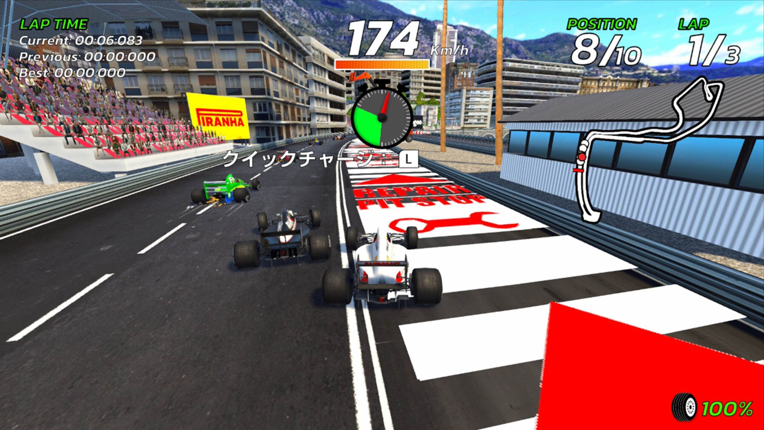 モチーフがモチーフなので「リッジ」や「デイトナ」「セガラリー」とは異なり派手にドリドリするのではなく、「バーチャレーシング」や「セガ・ツーリングカー」、「インディ500(そろそろちゃんとした移植版を出してくれ…)」と同じくコーナー直前でしっかり減速するグリップ走行で走るのが基本。現実のF1ではレギュレーション違反になりそうなニトロシステムも実装されていて、コースに配置されているピットレーンを走行することで回復できるようになっています。なお残念ながらピットクルーはいませぬ…